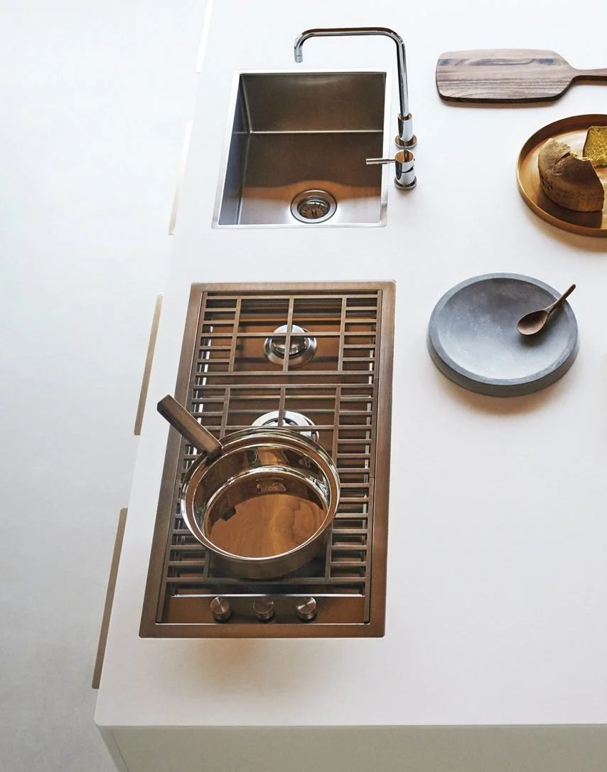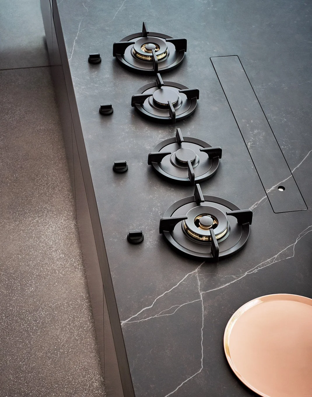 These gas burners, shown here with brass trims on a Dekton top, can be arranged as preferred and fitted directly into the worktop.