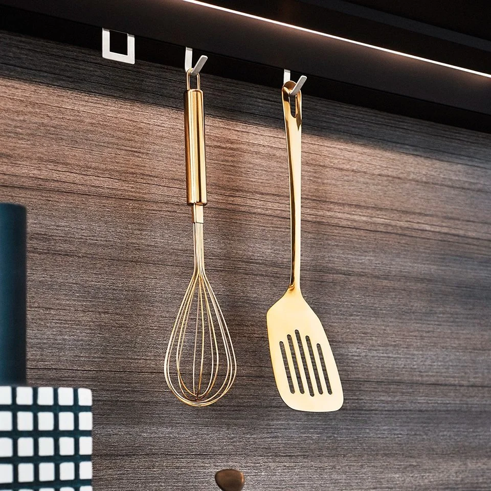 Various utensils can be hung from the hooks to optimise the space available and have everything readily at hand.