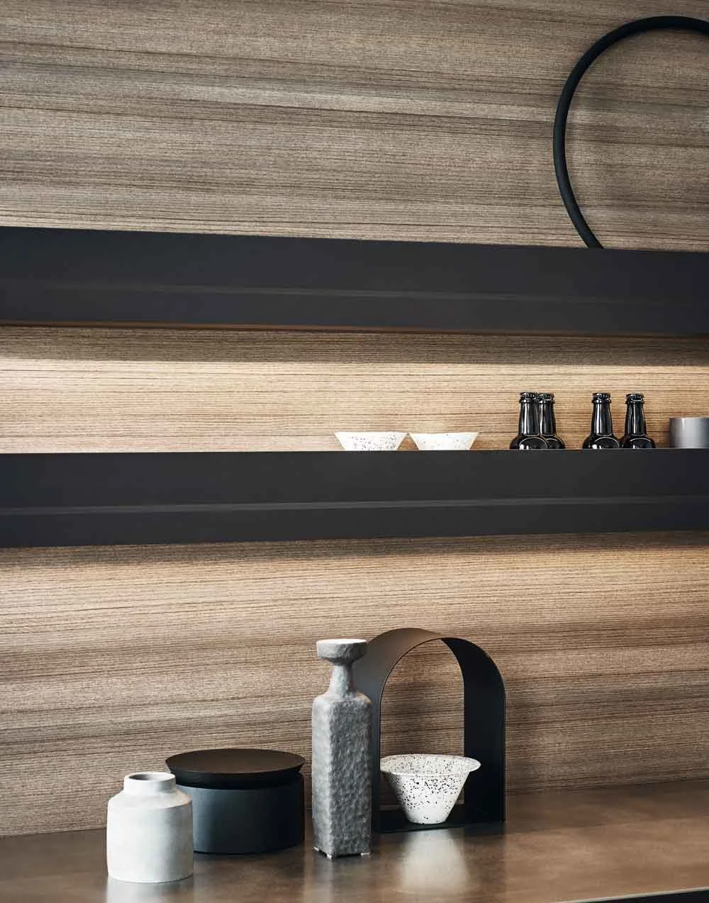 When shut, the pull-down flap organises and conceals many of the small accessories used in the kitchen; when open, it becomes an additional shelf that increases the surfaces available.