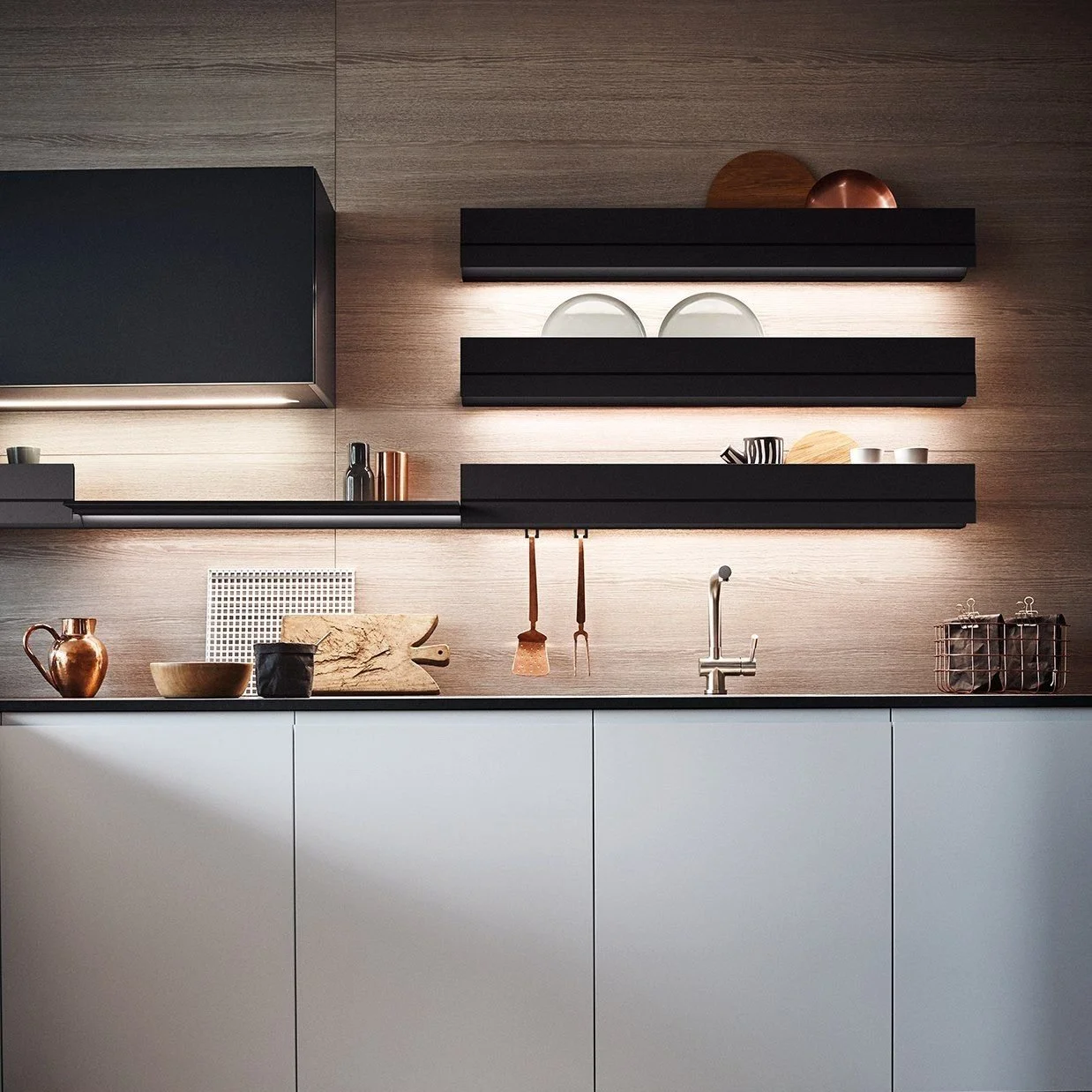 Wall Waiter is an innovative multi-functional module that can hold and organise many of the objects used in the kitchen. The pull-down front becomes an extra shelf while the integrated led light illuminates the worktop and the accessories used most frequently. The modules can be used on their own, in a line or one on top of the other for utmost planning freedom.