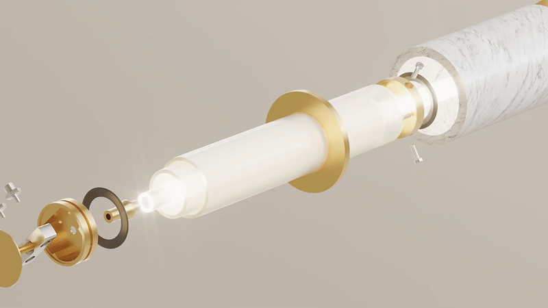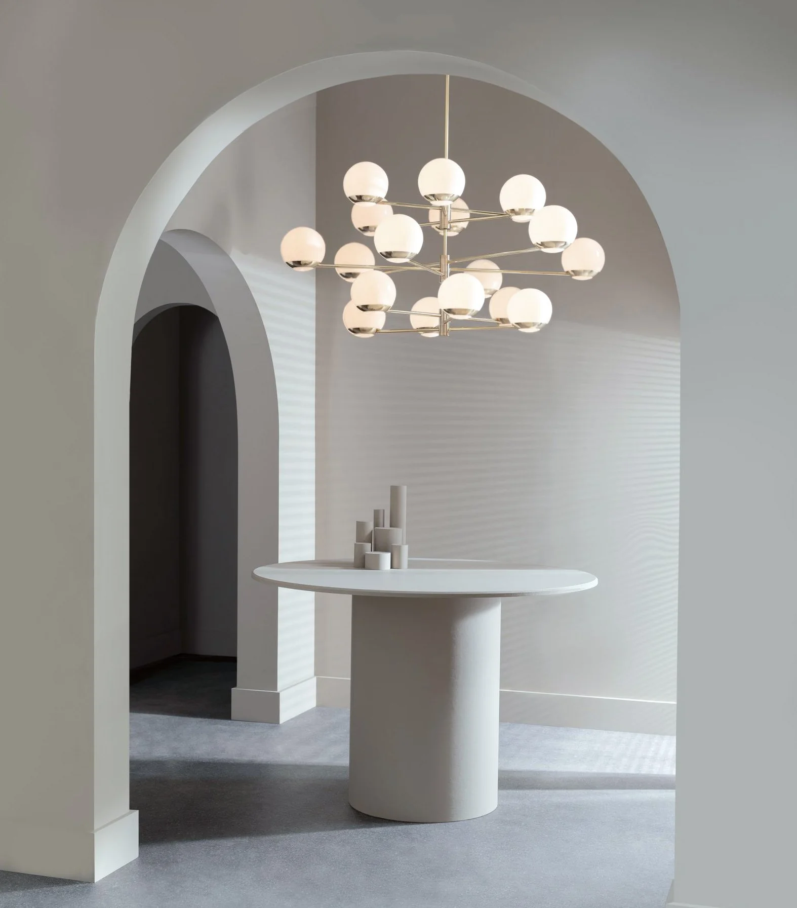 Made from frosted glass, polished marble and brass materials. Configured to be suspended vertically or horizontally. Available in a variety of states and finishes.