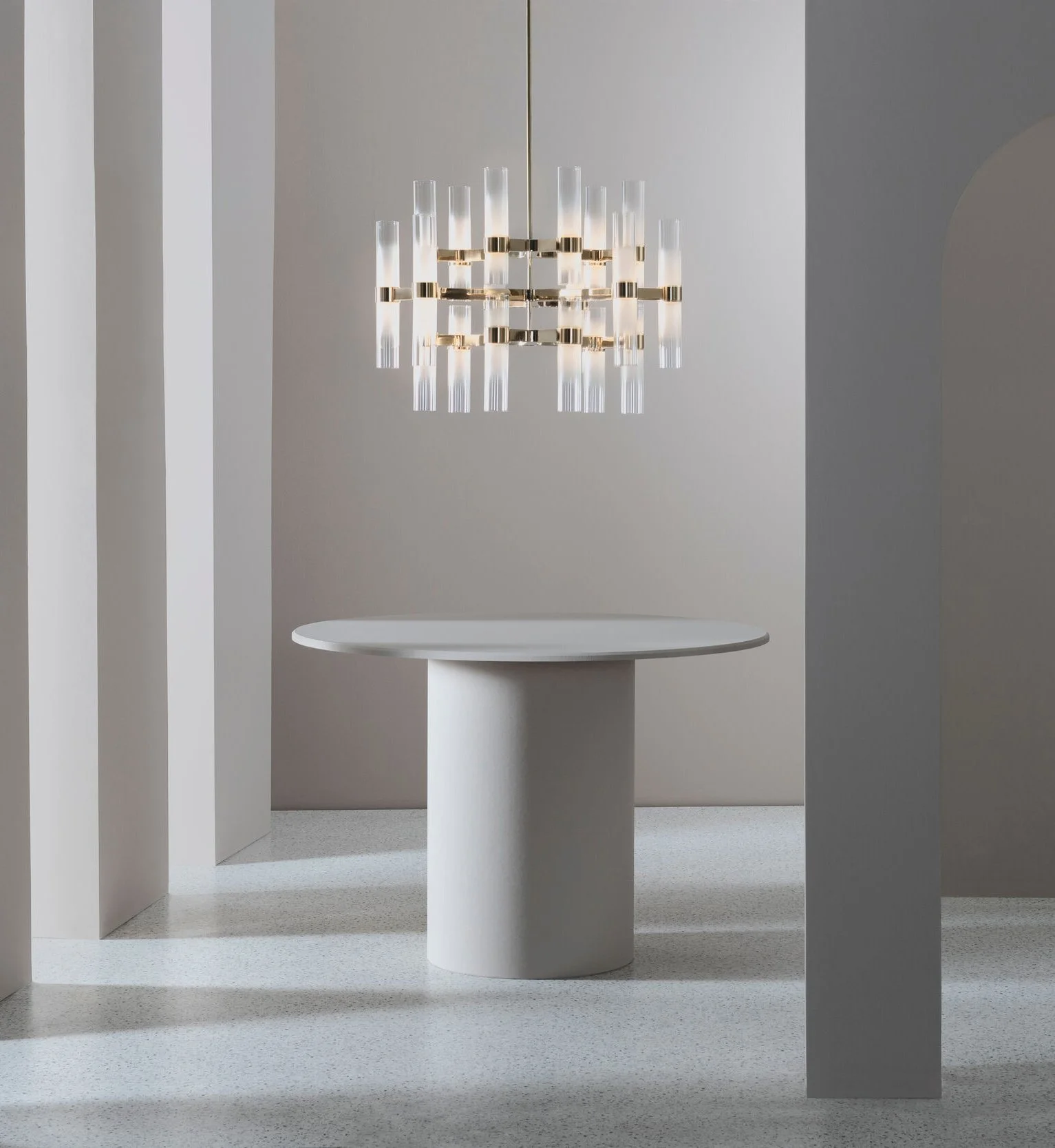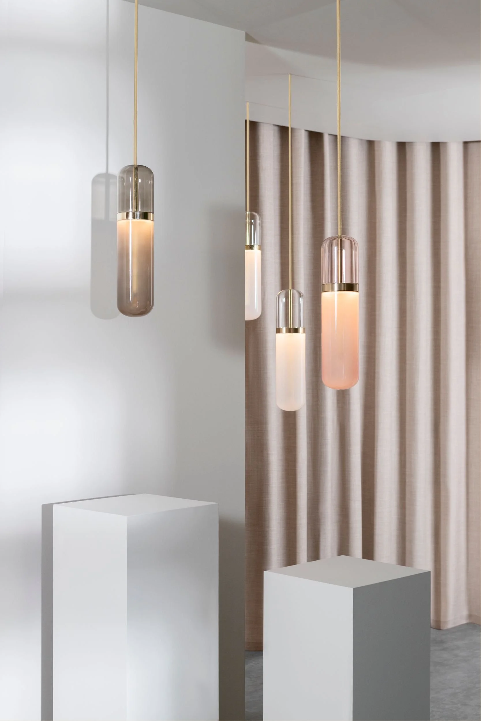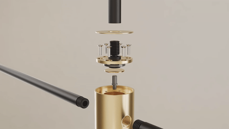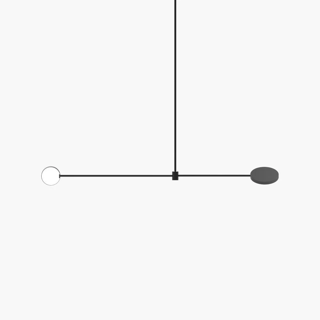Metal rods hang at opposing angles, balanced by illuminated brass discs.